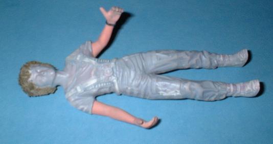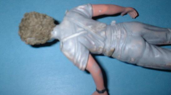 Die Figur ist mit Surfacer grundiert und nochmals angeschliffen, um unsaubere Stellen der Klebefuge auszubessern. Die Haare habe ich mit Feinspachtel aus dem Baumarkt neu angelegt. |