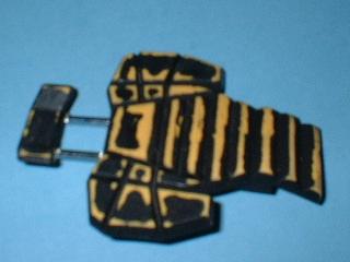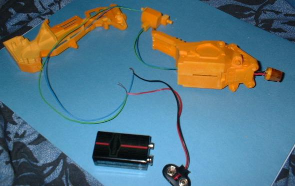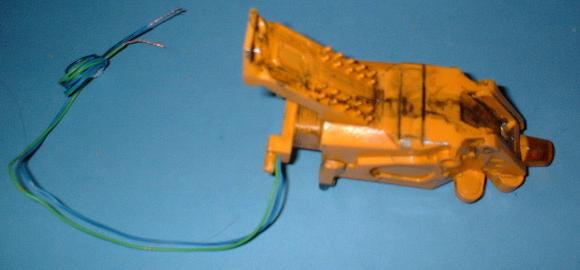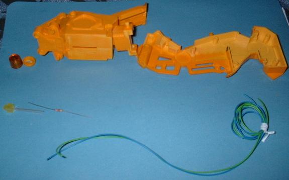 Die Kabel habe ich durch den Korpus bohren müssen, da er innere Verstärkungen hat. Sie führen durch das "Hüft"-Gelenk in das rechte Beinteil. Von dort werden sie später durch den Fuß in die Base geleitet, in der ich einen 9V-Akku-Block verbergen werde. Irgendwo muß dann nur noch ein Schalter einfügen ;-) |