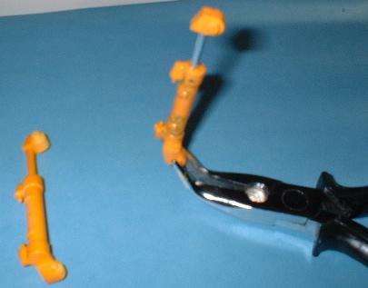 Weil die Zangen so klein sind, entschloß ich mich, sie zumindest bei dieser Seite nicht beweglich zu machen und habe die mit Stahlstiften fixiert. |